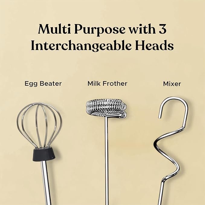 - Multiple Attachment Heads: Milk Frother: Create rich and creamy froth for lattes, cappuccinos, and more. Egg Beater: Effortlessly whisk eggs for omelets or blend batters for pancakes and cakes. Mixer: Perfect for a variety of tasks, from blending drinks to stirring sauces with precision.
