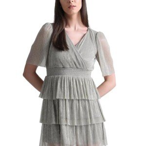 ONLY Women Smocked V- Neck Flared Sleeves Tiered Mini Sheen Wrap Dress